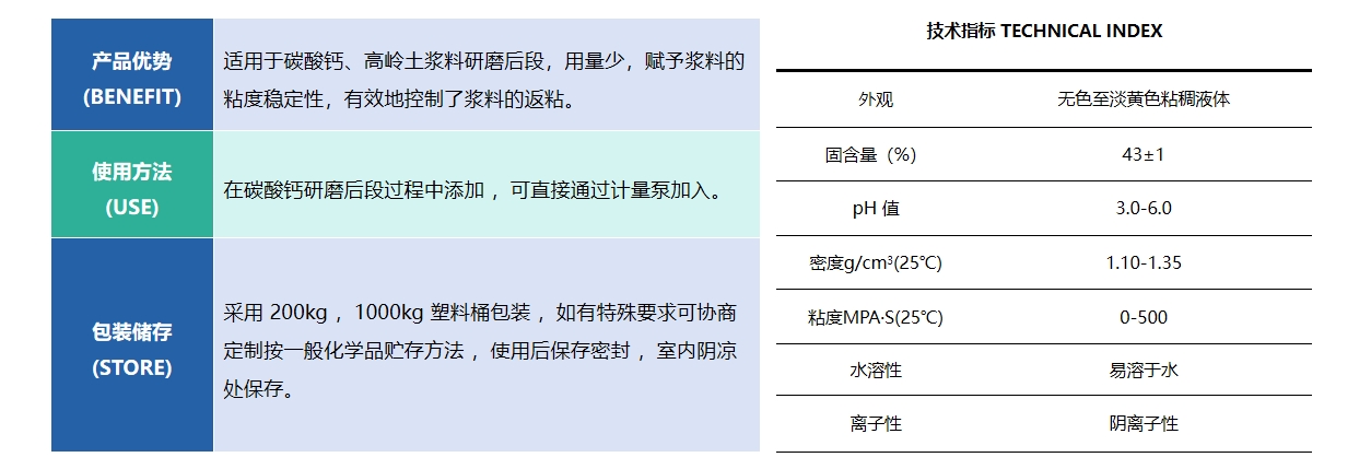 HQ-S933M 分散劑,可與水任意比例互溶,提高碳酸鈣和高嶺土研磨后段料 漿的穩定性。